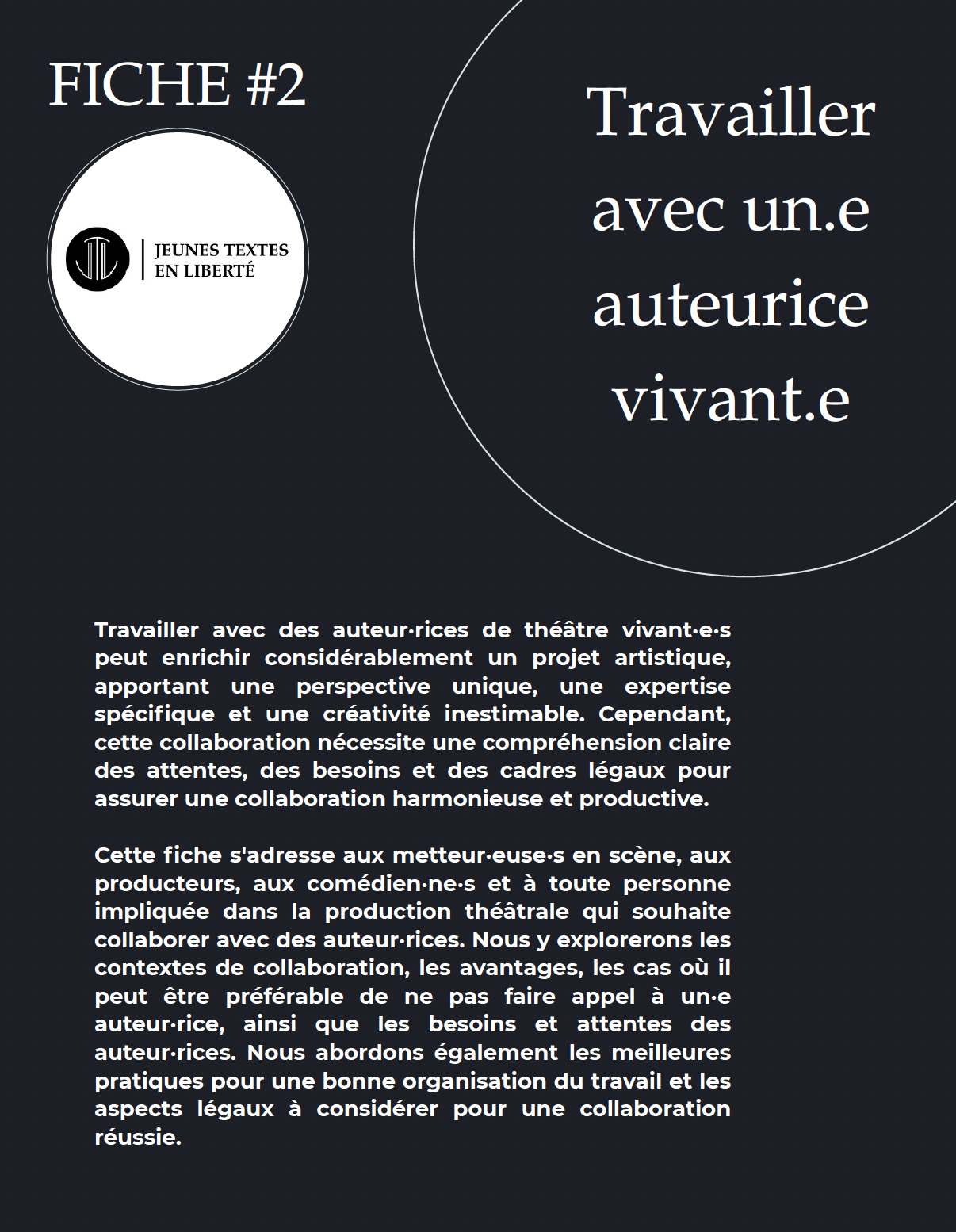 Travailler avec des auteur·rices de théâtre vivant·e·s peut enrichir considérablement un projet artistique, apportant une perspective unique, une expertise spécifique et une créativité inestimable. Cependant, cette collaboration nécessite une compréhension claire des attentes, des besoins et des cadres légaux pour assurer une collaboration harmonieuse et productive. Cette fiche s’adresse aux metteur·euse·s en scène, aux producteurs, aux comédien·ne·s et à toute personne impliquée dans la production théâtrale qui souhaite collaborer avec des auteur·rices.